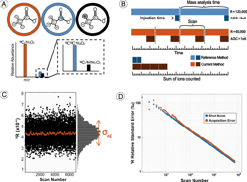 Acetate (C2H3O2) plays a central role in the metabolism of many -- arguably most -- organisms. It is produced by the aerobic respiration of sugars, by anaerobic fermentations, and from CO2 by autotrophic acetogenesis. It is also readily consumed by a wide range of microbes doing aerobic or anaerobic respiration. And of course it is the required precursor for building many lipids. Given this central role, knowing its C and H isotope composition should be very informative about how all those processes are competing to produce or consume acetate, and thus how the system as a whole works. But it has historically been very hard to measure acetate: its nonvolatile and won't go through a GC until you derivative it, at which point its too volatile to handle easily. Its typically present at very low concentrations so can't be easily isolated in sufficient quantity for EA-based measurements, and existing LC-IRMS methodologies struggle to separate it from complex samples. Elliott Mueller, a Ph.D. student in my group, has now shown that he can simultaneously measure δ13C and δD of acetate using an Orbitrap mass spectrometer with electrospray ionization. The measurement achieves performance metrics (accuracy and sensitivity) that are better than all preceding methods, in ~20 minutes, without having to derivatize the acetate. The methodology should be applicable to other small, water-soluble organic molecules and promises to profoundly improve our ability to examine these substrates and intermediates of metabolism in natural samples. The work is published in the January issue of Analytical Chemistry.